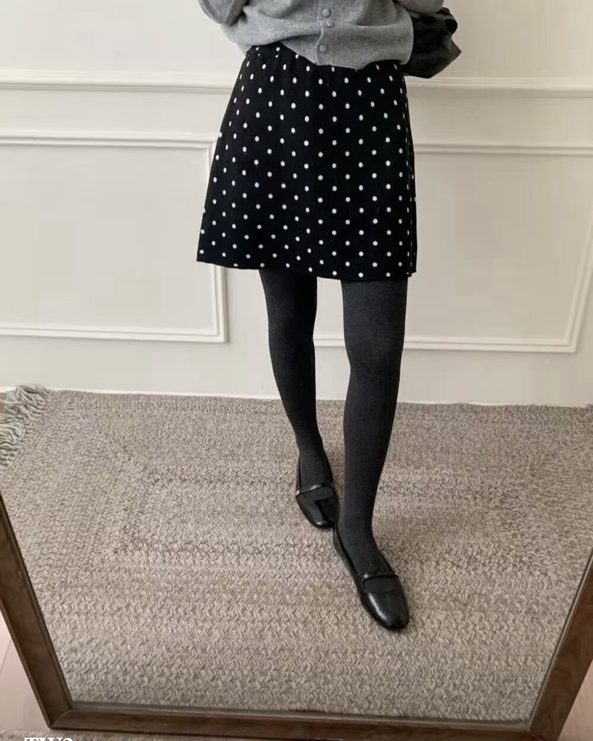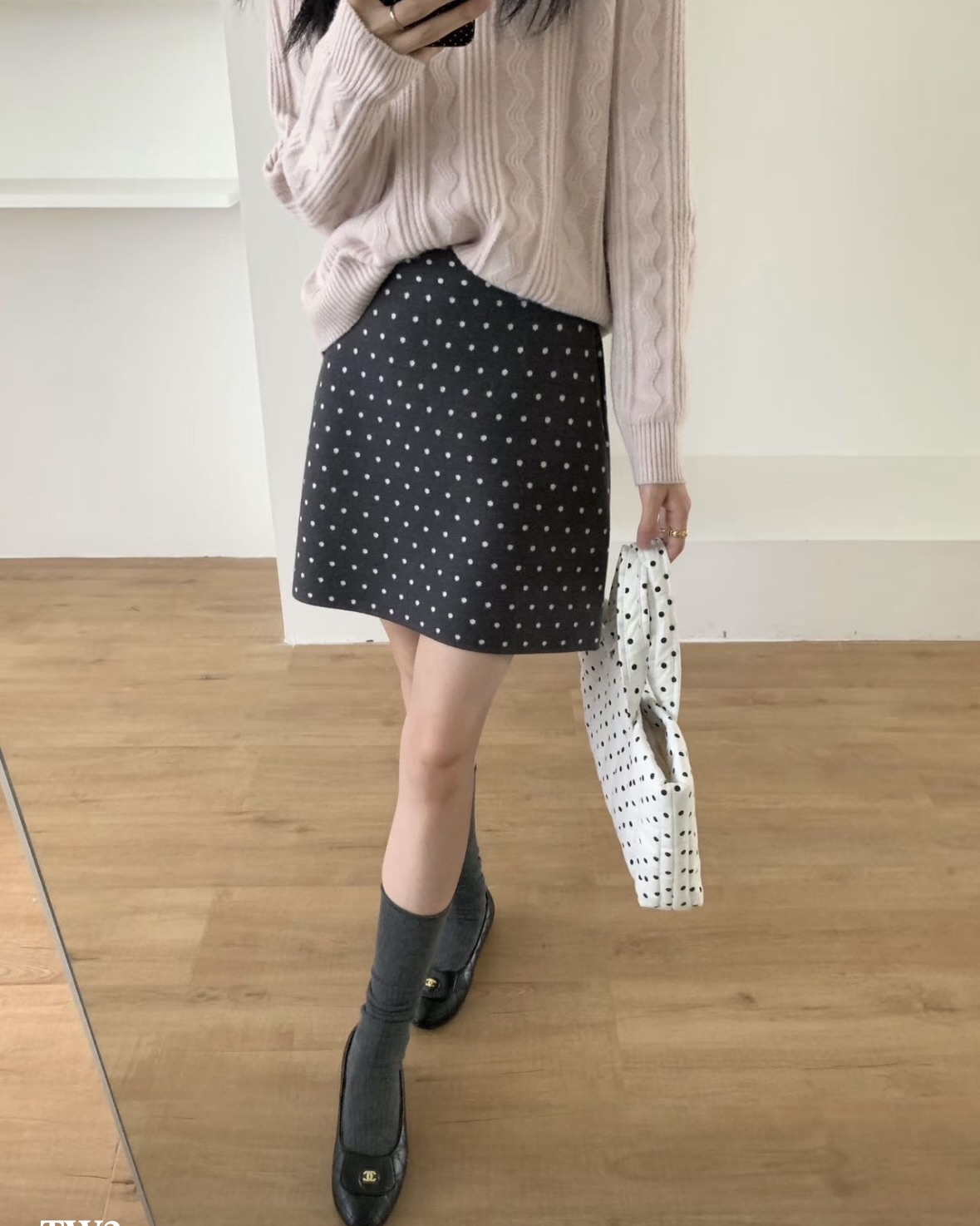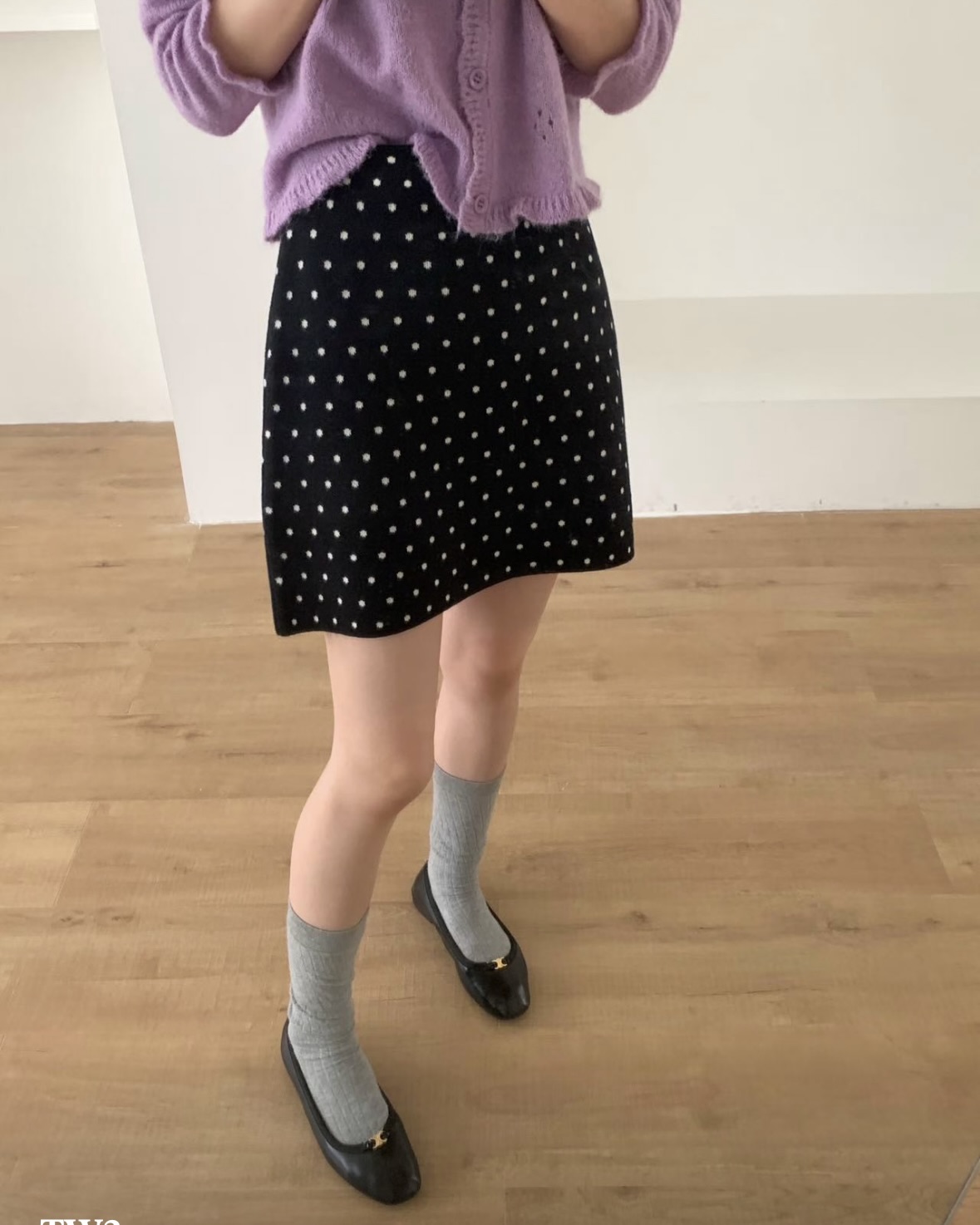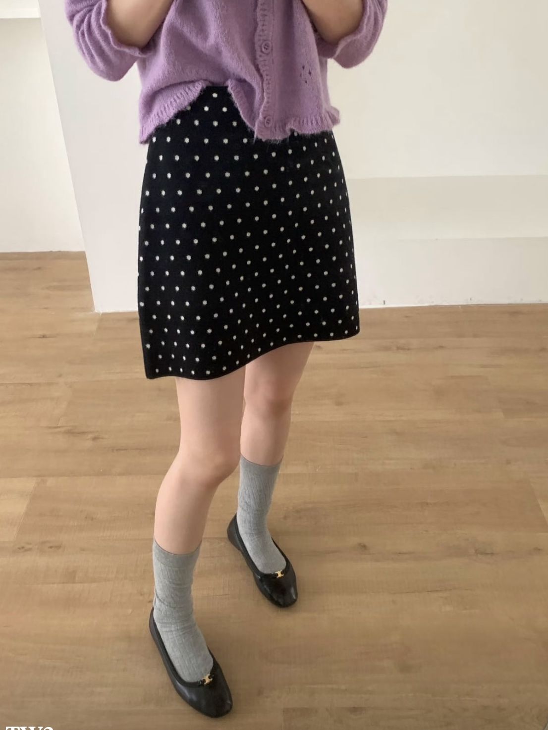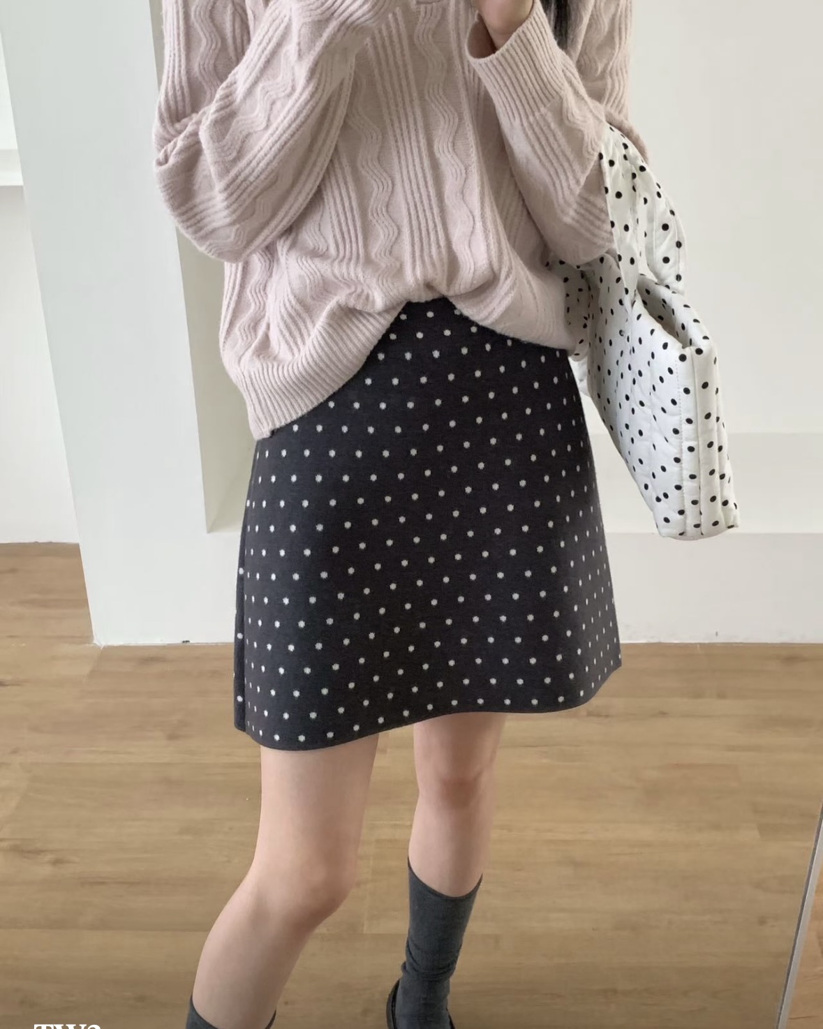 잔잔한 도트가 콕콕 박힌 니트 스커트예요.
