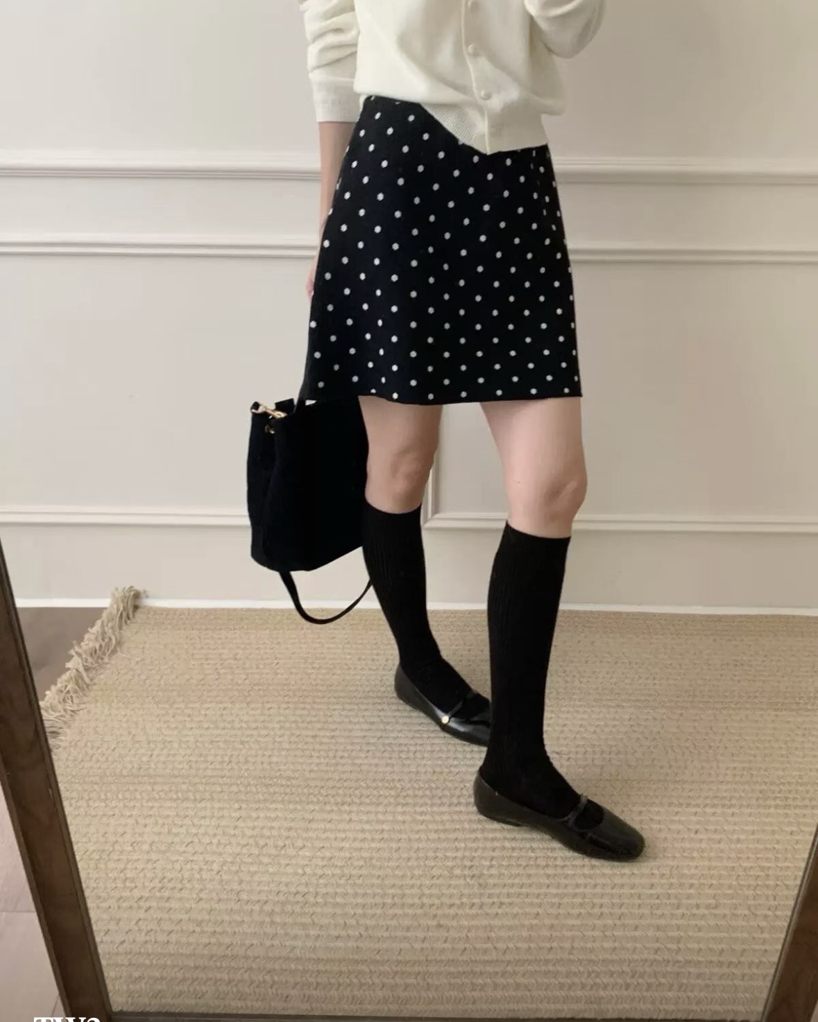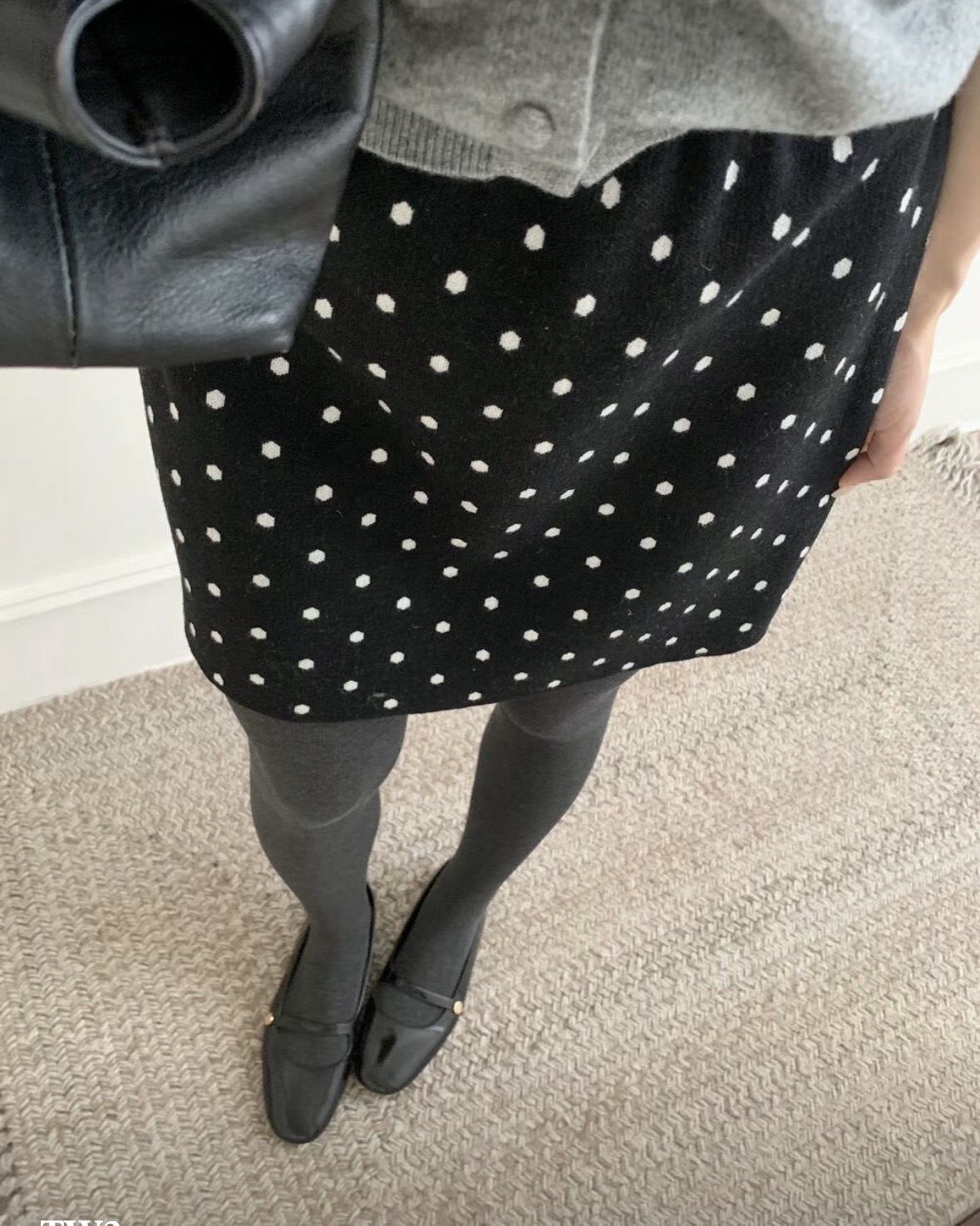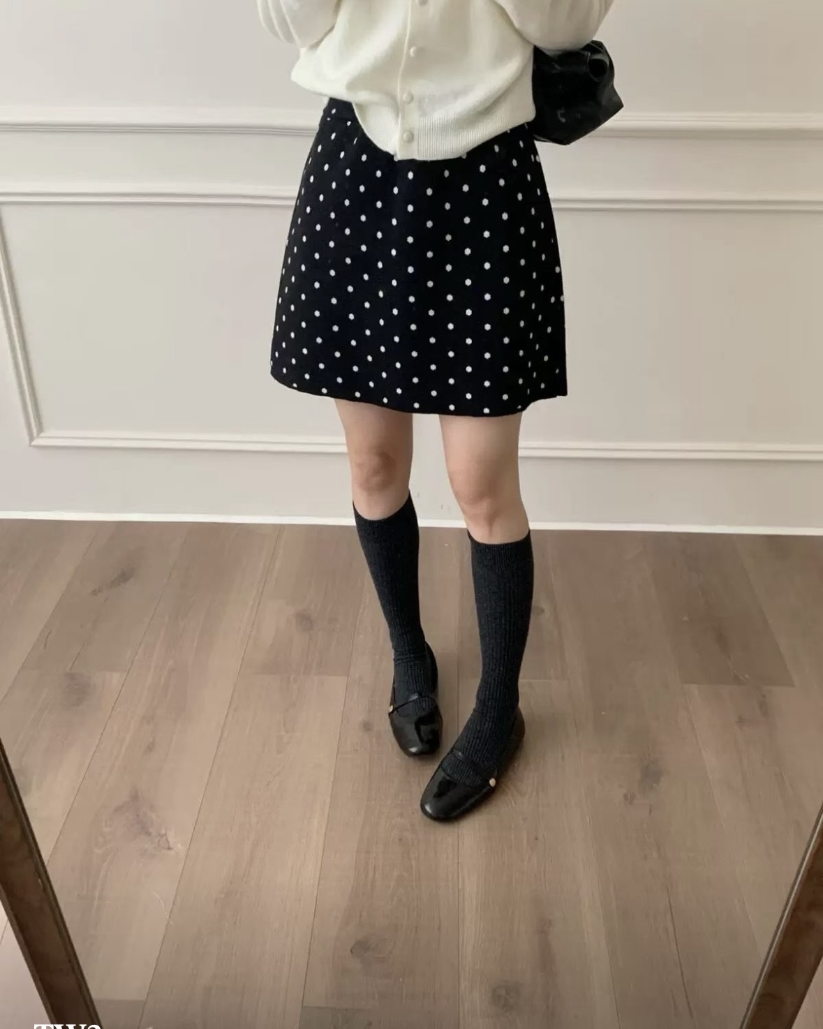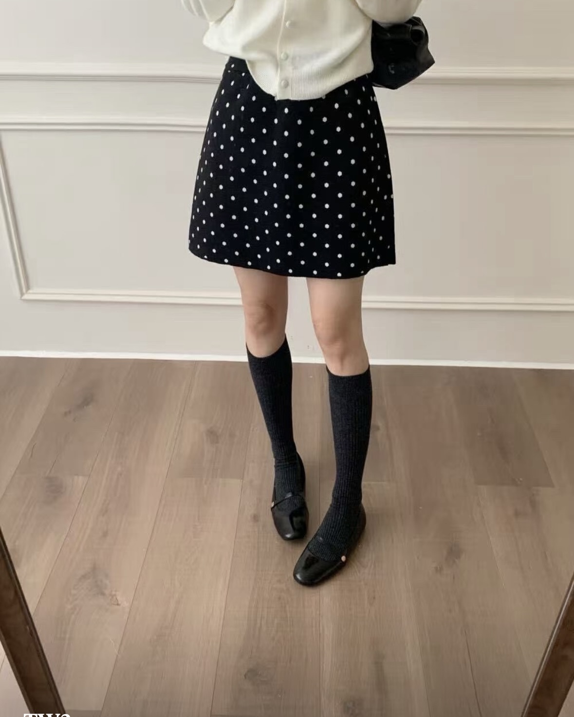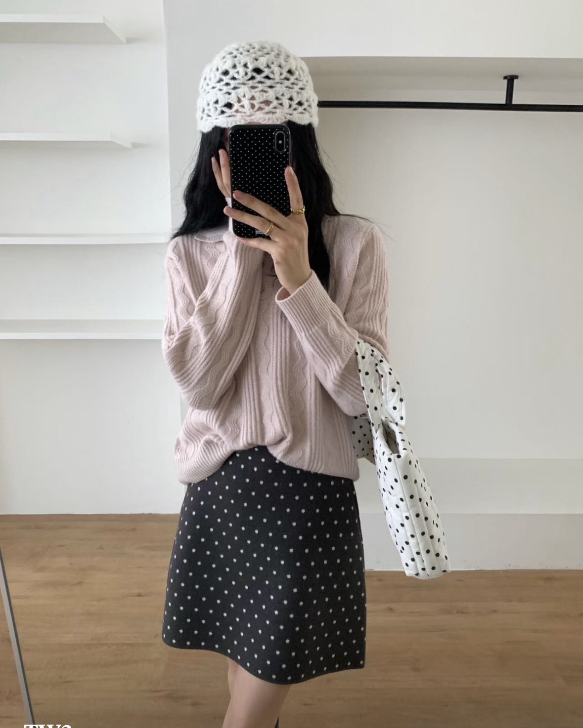 잔잔한 도트가 콕콕 박힌 니트 스커트예요.