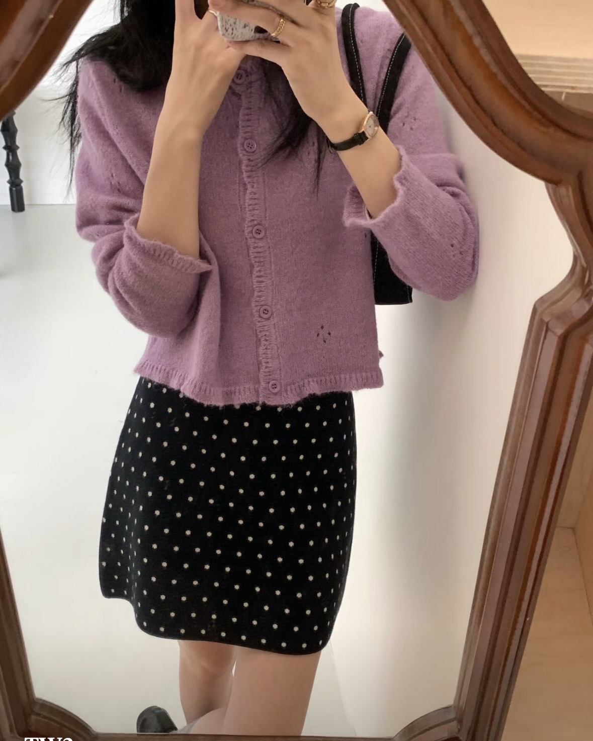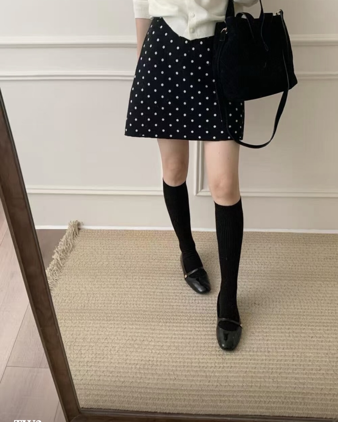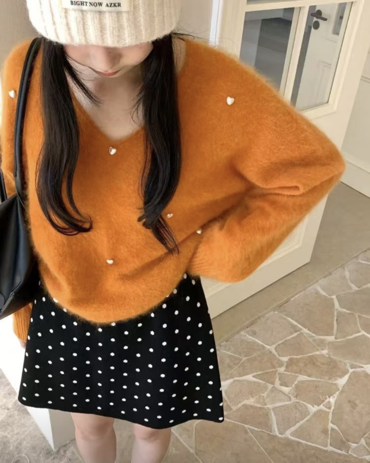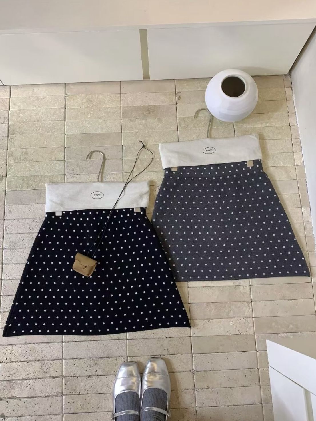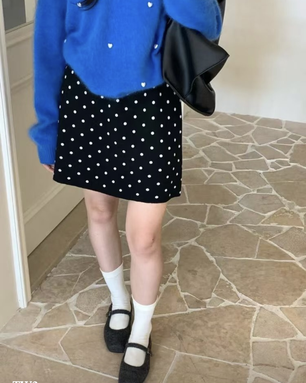 잔잔한 도트가 콕콕 박힌 니트 스커트예요.